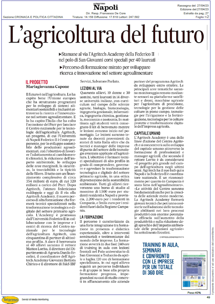 L’Agritech Academy è una delle linee d’azione del Centro Agritech e si concentrerà sullo sviluppo del capitale umano attraverso la formazione di professionisti e manager agricoli, che secondo il rettore Lorito è da considerarsi «il progetto più grande nel campo dell’agricoltura negli ultimi anni, Agritech ha il suo hub qui a Napoli e la Federico II è coordinatore nazionale, É un riconoscimento per quanto in Campania è stato fatto nell’agroalimenta re». «Le attività del Centro saranno fondamentali anche per la crescita delle aziende meno moderne. La Agritech Academy formerà giovani tecnici che potranno assisterle nell’adozione delle tecnologie abilitanti nei loro processi produttivi con enorme potenziali ed efficacia sull’aumento della produttività e sulla riduzione degli sprechi e dell’impatto ambientale delle produzioni agricole» ha sottolineato Ercolini.