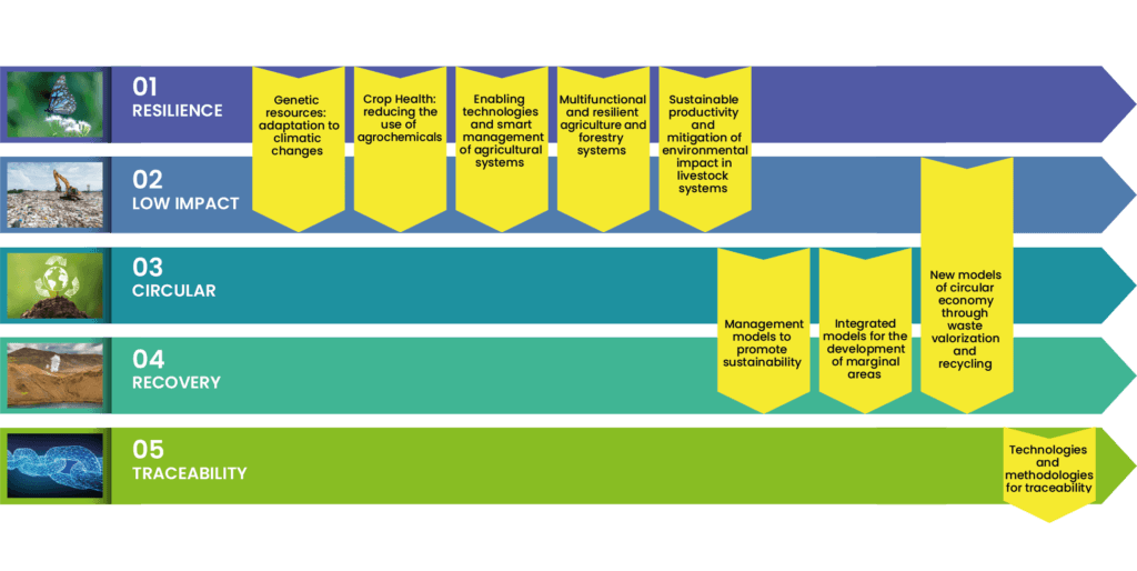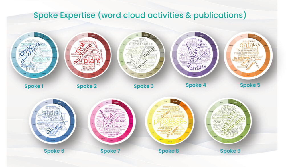 An analysis of the current state-of-the-art of Italian research in agriculture clearly indicates a consolidated track record of activities aiming to enhance crop yield, quality and sustainability of production strategies, as can be easily inferred by the publications produced in the last 6 years (see section A1.3). These are the key- elements on which the Italian scientific community will build upon to face the big challenges outlined in the previous section, through the development of tailored new materials and production strategies meeting at the best the constraints imposed by the unstable climatic conditions, and by the specific ecological and socio- economic requirements of different geographic areas. These are the major gaps to fill, starting from a well- established tradition of scientific research. The use of cutting-edge technologies will be implemented at all levels, to foster the digitalization and de-carbonization of the green transition of agriculture, but always taking into consideration the protection of the typical traits of agri-food products, and the certification of their quality and of the ecological sustainability of the production process. In our vision, the general objectives outlined above can be achieved by allocating Agritech research efforts on 9 different strategic thematic areas, that will be the domains of investigation and exploitation of 9 different spokes: